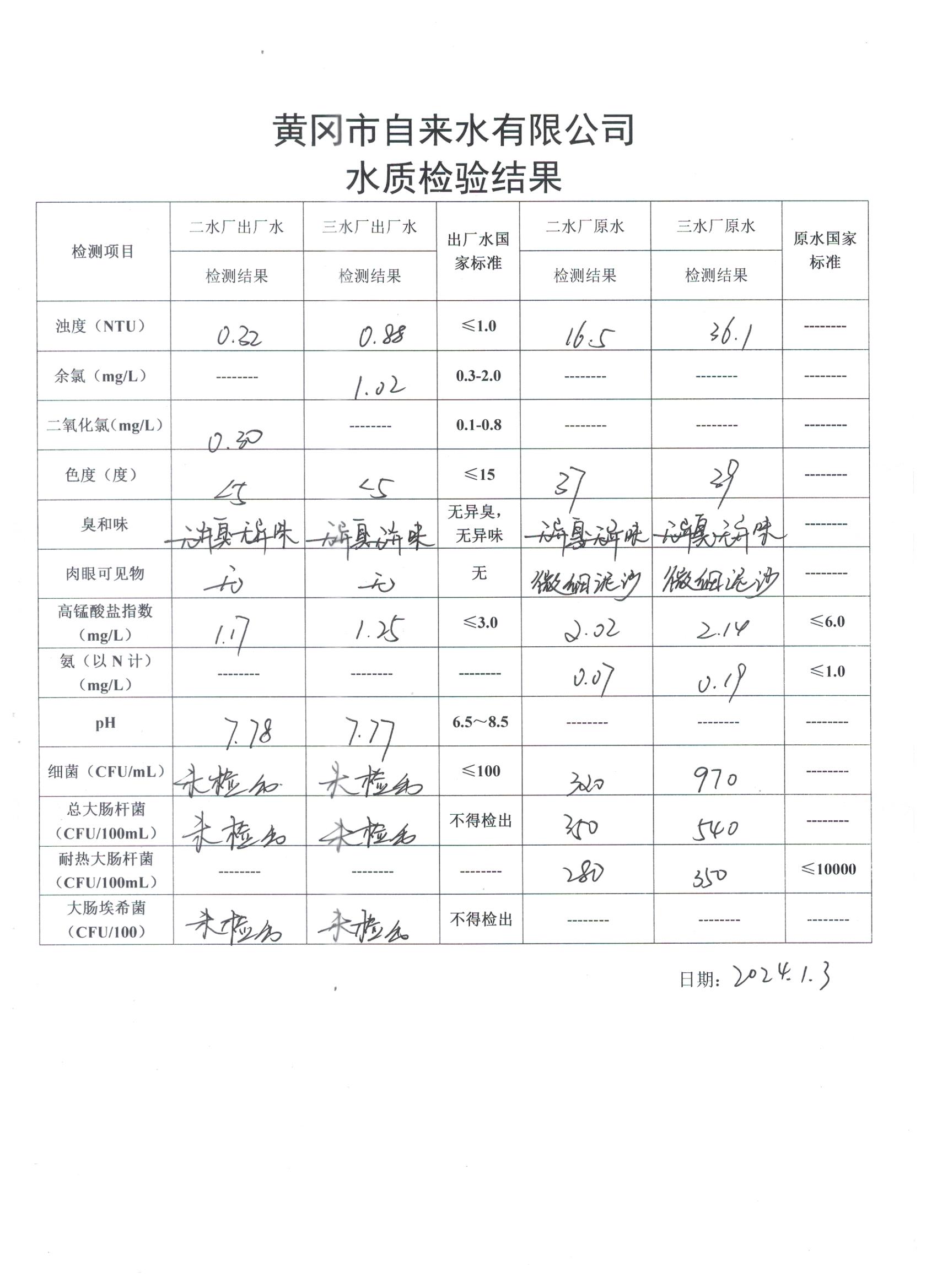 2024年1月3日水質(zhì)檢驗(yàn)日?qǐng)?bào)表