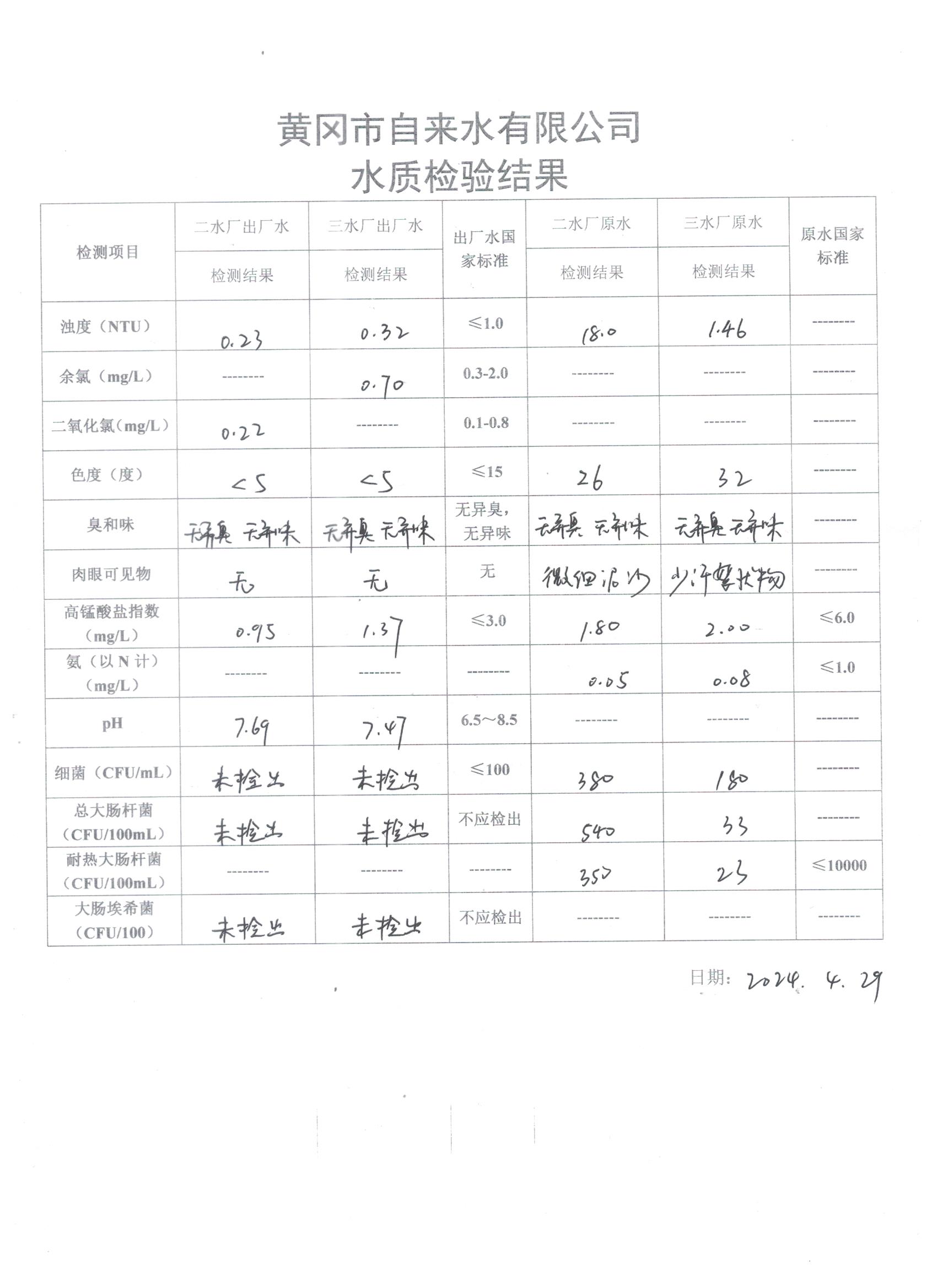 2024年4月29日水質(zhì)檢驗(yàn)日?qǐng)?bào)表