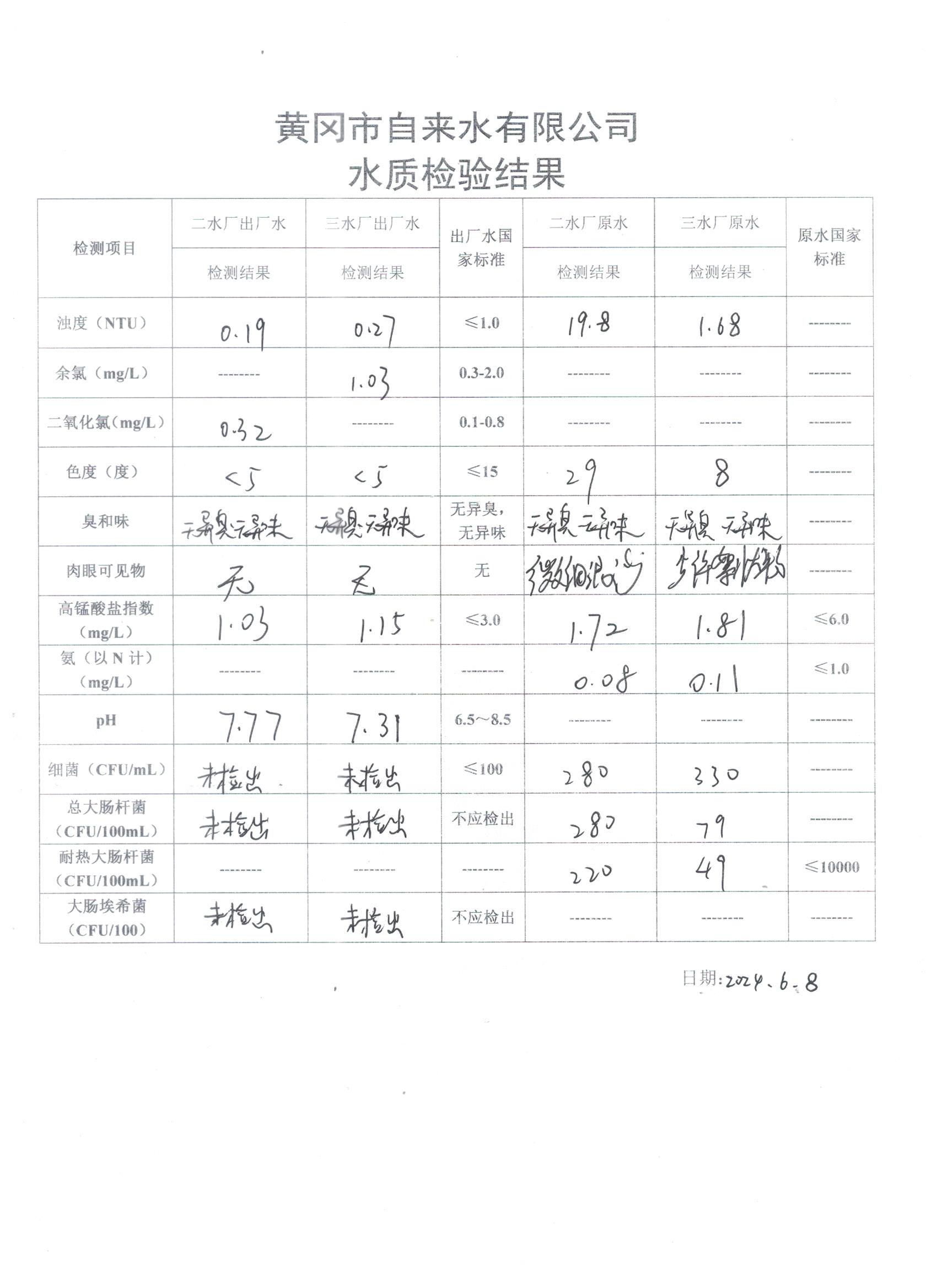 2024年6月8日水質(zhì)檢驗(yàn)日報(bào)表