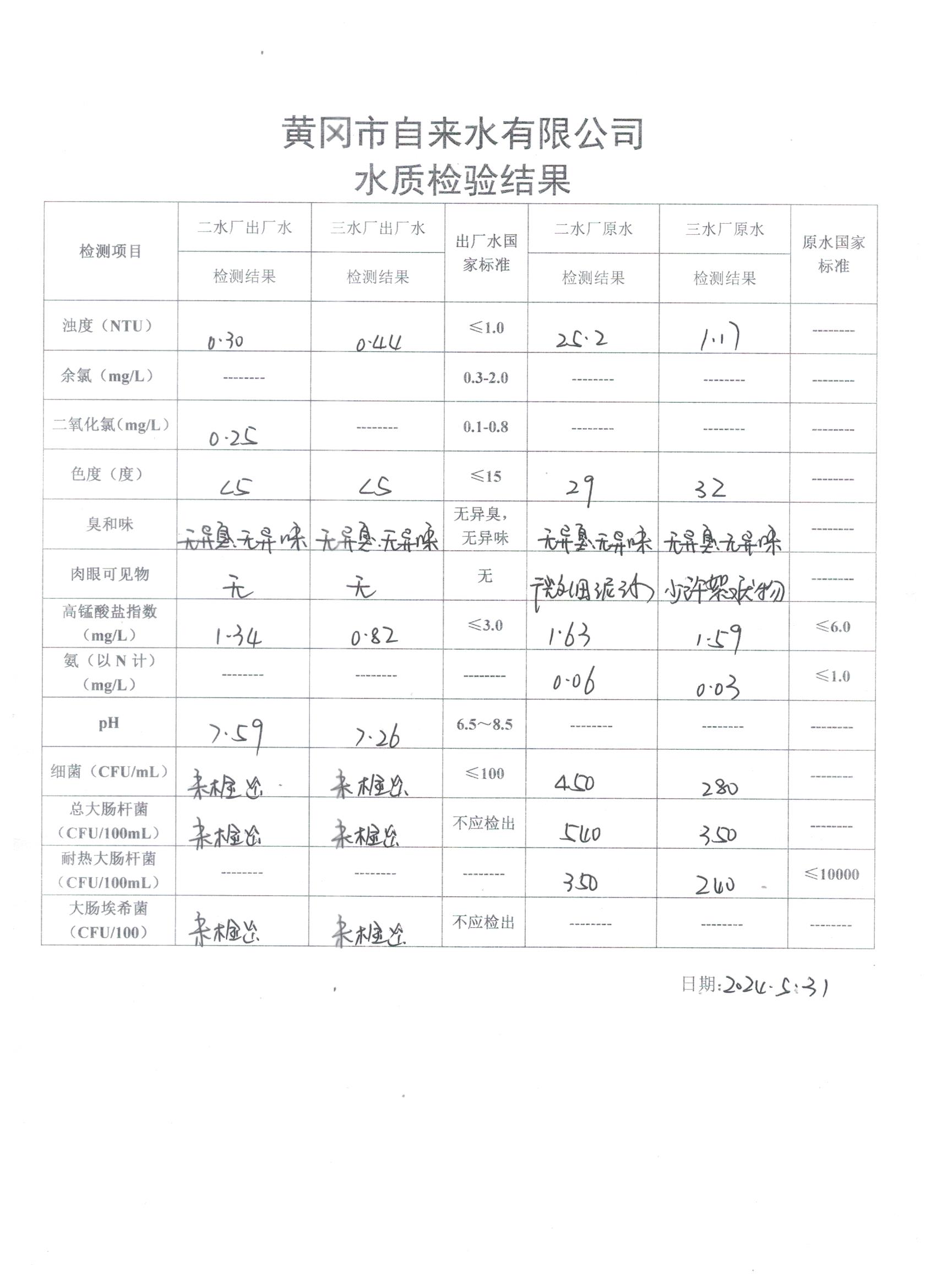 2024年5月31日水質(zhì)檢驗(yàn)日報(bào)表